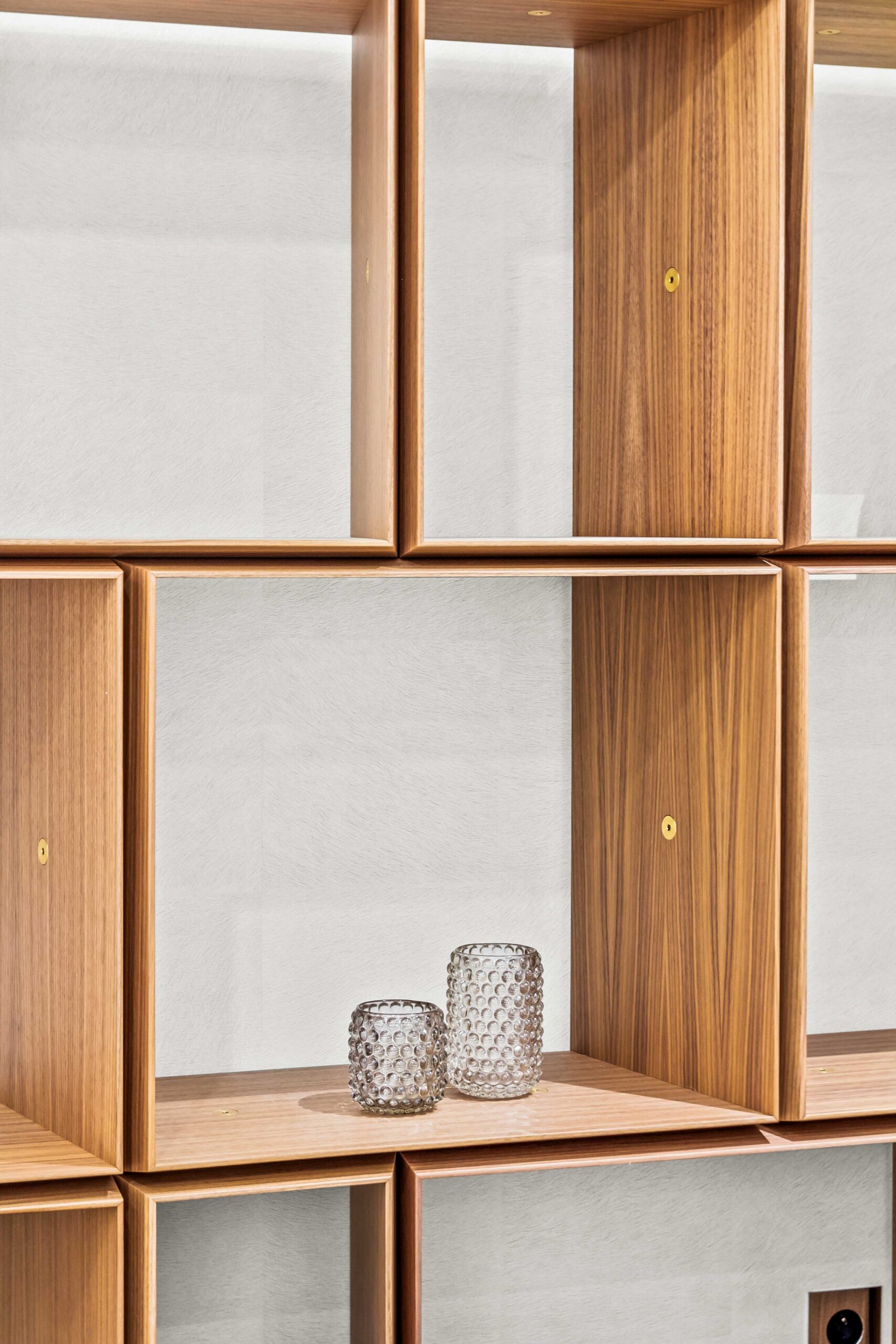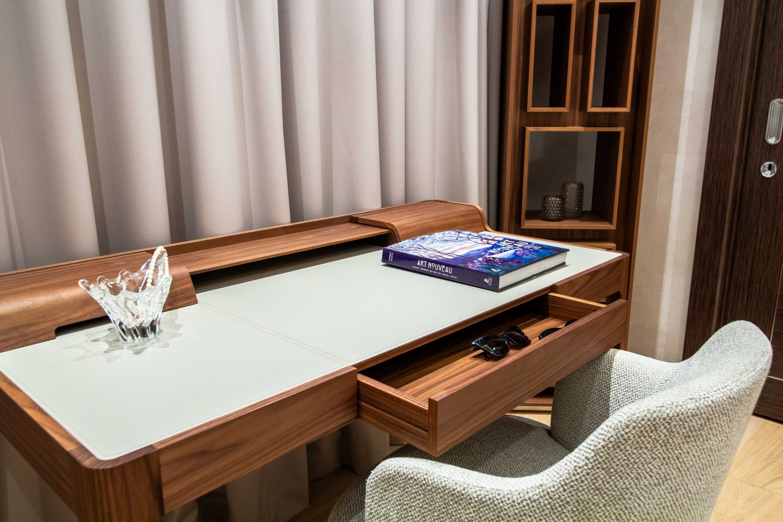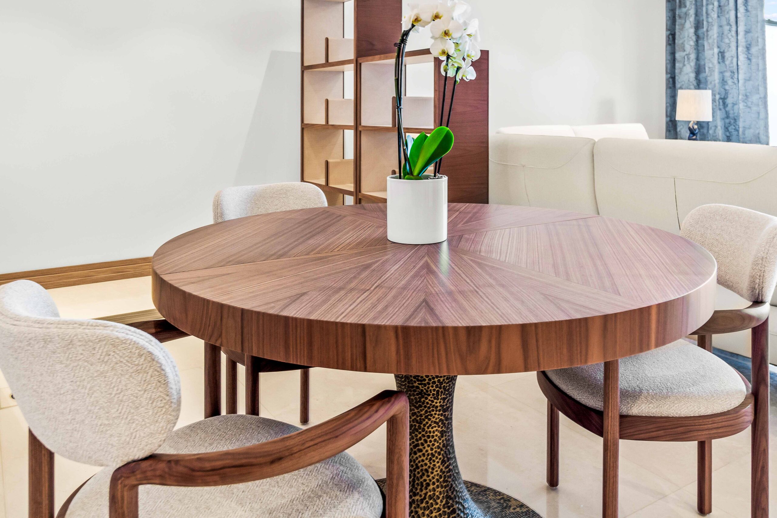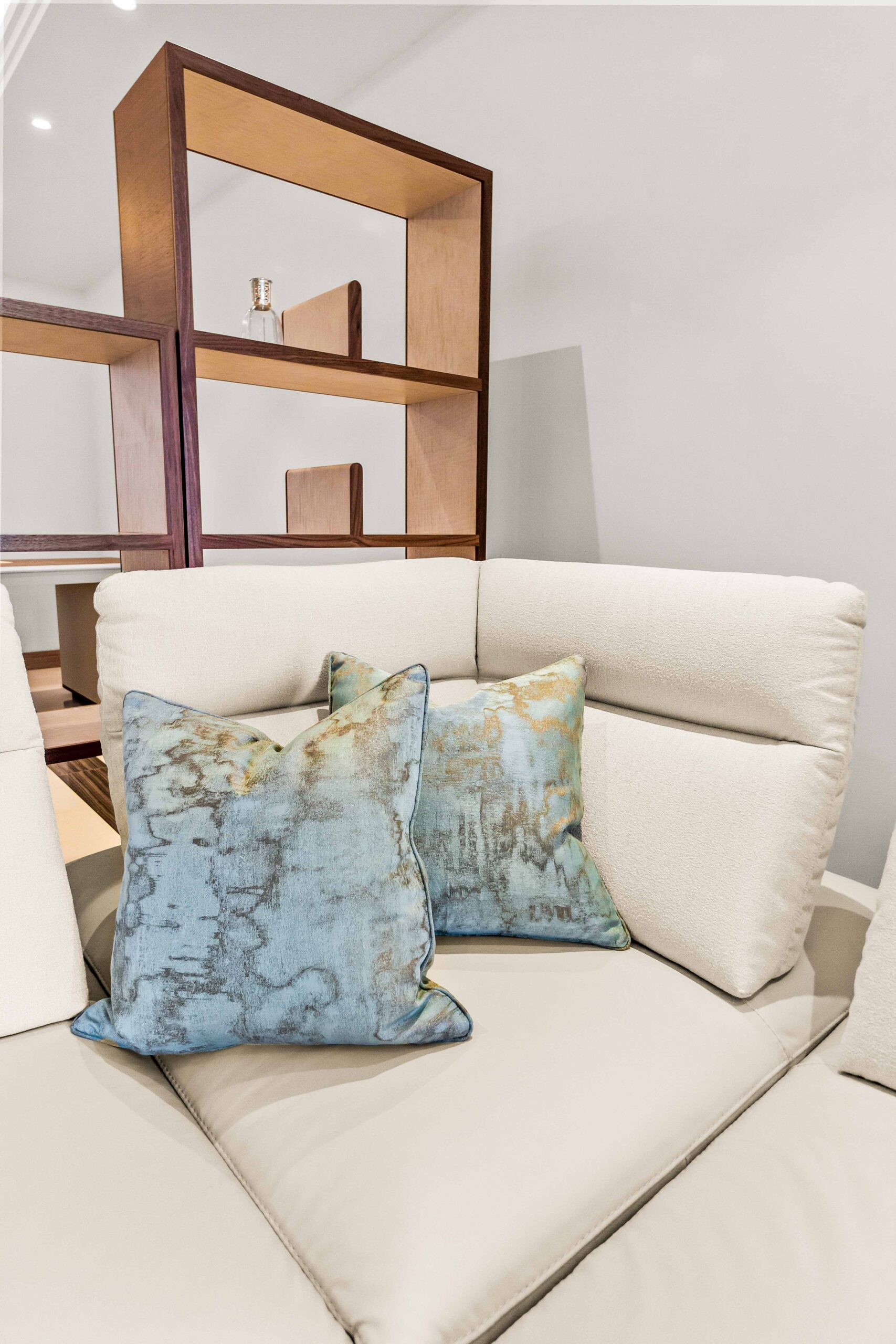 The living area, the true heart of the apartment, offers a generous layout. However, it feels intimate and comfortable thanks to a careful play of colors and custom-made furniture. At its center stands a large marble table, designed to host many guests. Above it, a sculptural chandelier becomes the visual focal point of the space. In addition, equipped partitions and open shelving units create rhythm and depth, while a petrol-blue armchair adds a bold accent.